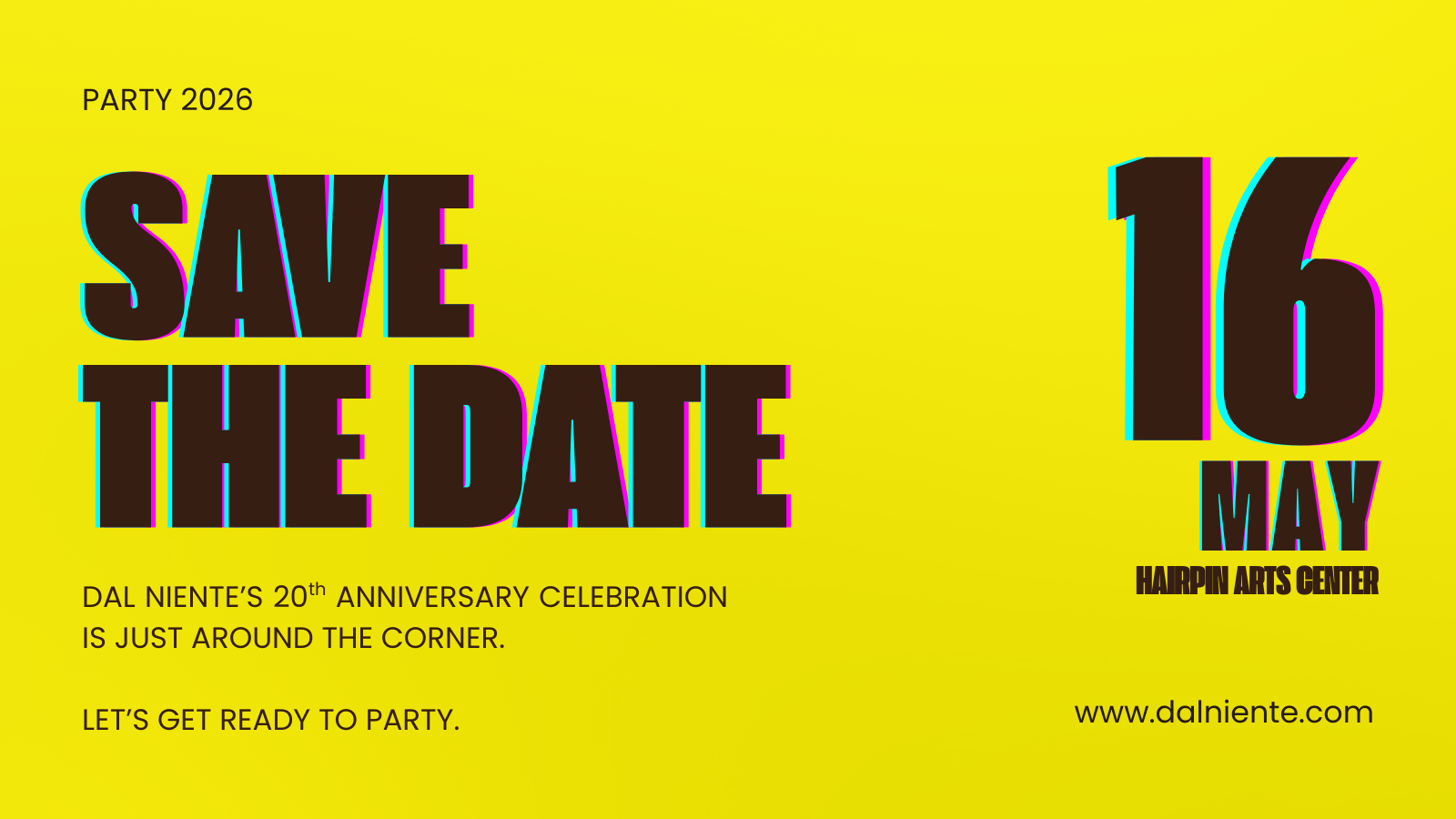 Celebrate 20 years of Ensemble Dal Niente! We’re back where the legend of the Party began. Drinks, music, and so much more. Join us and LET’S PARTY.