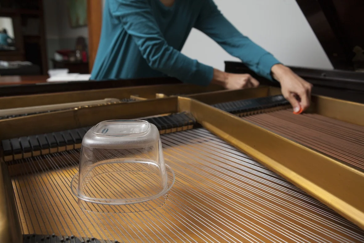 I'm really glad to know Santiago's music through a previous work for Dal Niente, and I'm thrilled that he wrote this solo piece for piano. The objects are basically plastic tupperware containers, a plastic wine glass, and a bass bow. It took some time to find the right plastic material; also it needed to make a certain pitch around G/G# which you'll hear is a central note in the piece. There are actually quite a few pieces with objects on this concert. Alex Lunsqui's Glaes or "glass" uses marbles, sandpaper, wine bottles, glass jars. Mauricio Pauly's Patrulla reliquia has intricate playing techniques for metal slide, plectra and effects pedals. Of course I always enjoy playing pieces like Rebecca Saunder's shadow which is on the keys with the hands (and in this case, arms and elbows too).