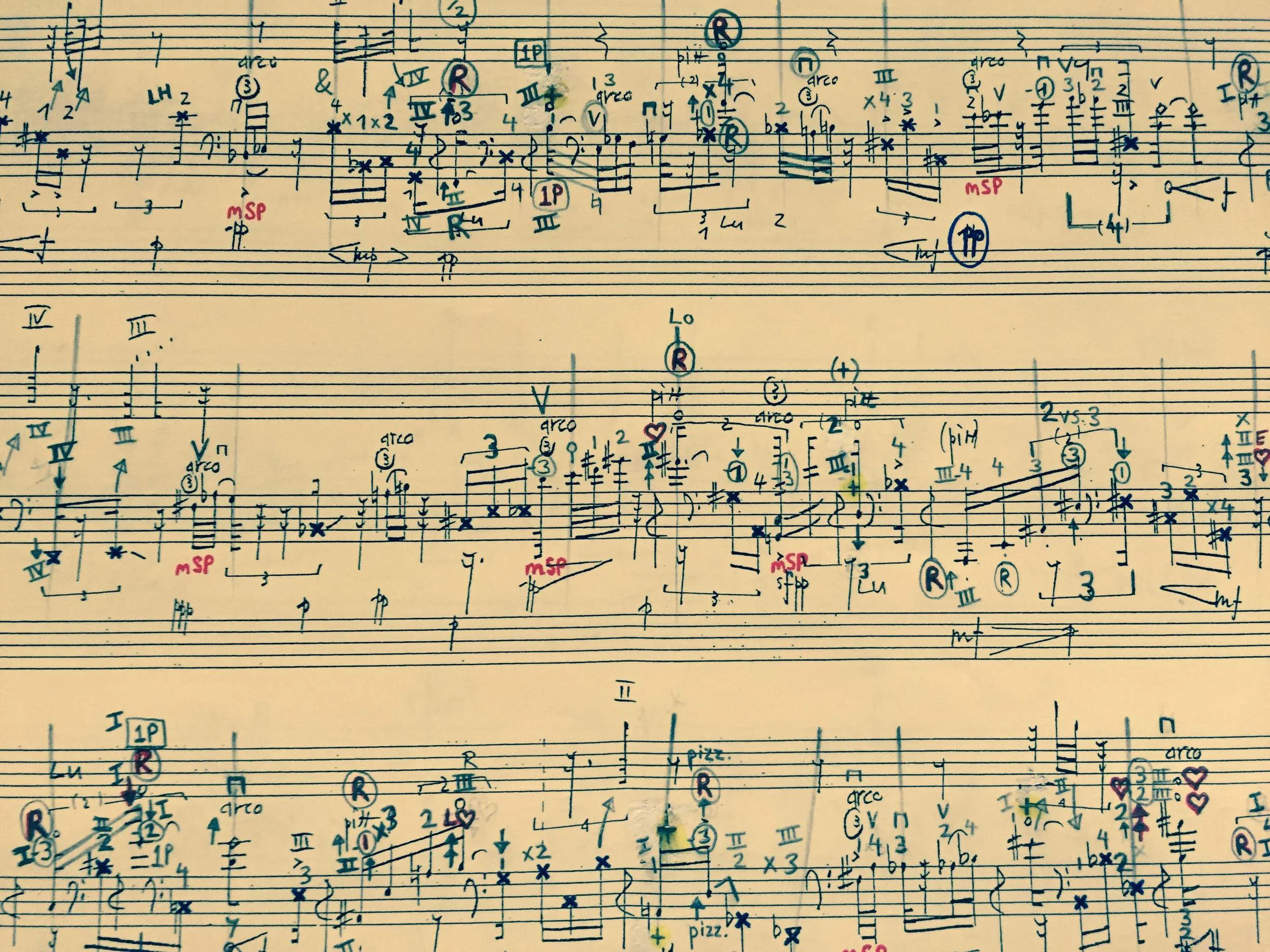 - July: At this point in time I need to consider how the composer's notation of extended techniques (or as our conductor Michael Lewanski calls them, "techniques") compares to my existing method for editing and recognizing techniques in circumstances such as this where I am rapidly alternating between them. In addition to editing techniques, I also consider where I will play all of the harmonics (which are usually played pizzicato - plucked - in this piece) since harmonics exist in multiple locations. With this in mind, I go through the score a third time, modifying the labeling of techniques and using Roman Numerals to indicate strings for harmonics. Further on harmonics: I usually try to play them in the upper register of the cello (nearer to the bridge) because they are easier to find and isolate up there. When I am forced to pluck a high partial harmonic down low in its "first position" location (due to surrounding "low" pitches), I label those with "1P." For harmonics that are high partials beyond the edge of the fingerboard (of which there are many), I identify their location by their proximity to the heart shape in the middle of my bridge, using that as a visual reference. Once I have finished going through the score with pencil (perhaps now having spent 12 hours with it), I resume my "vacationing" and plan to begin learning the piece with cello in hand back in Chicago.